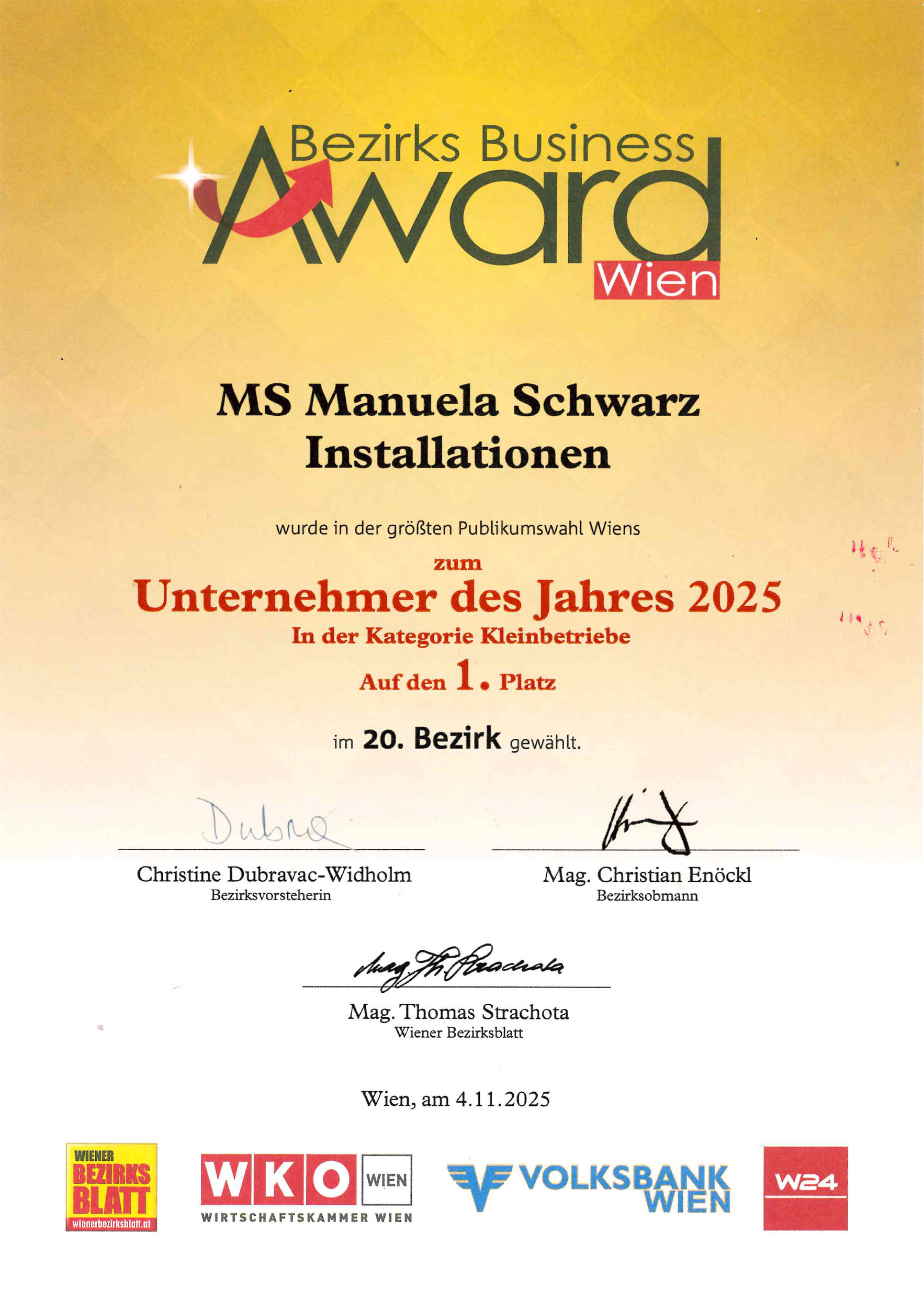 wir möchten uns herzlich für Ihre Stimme zum *Award Business 2025* im 20. Bezirk bedanken.